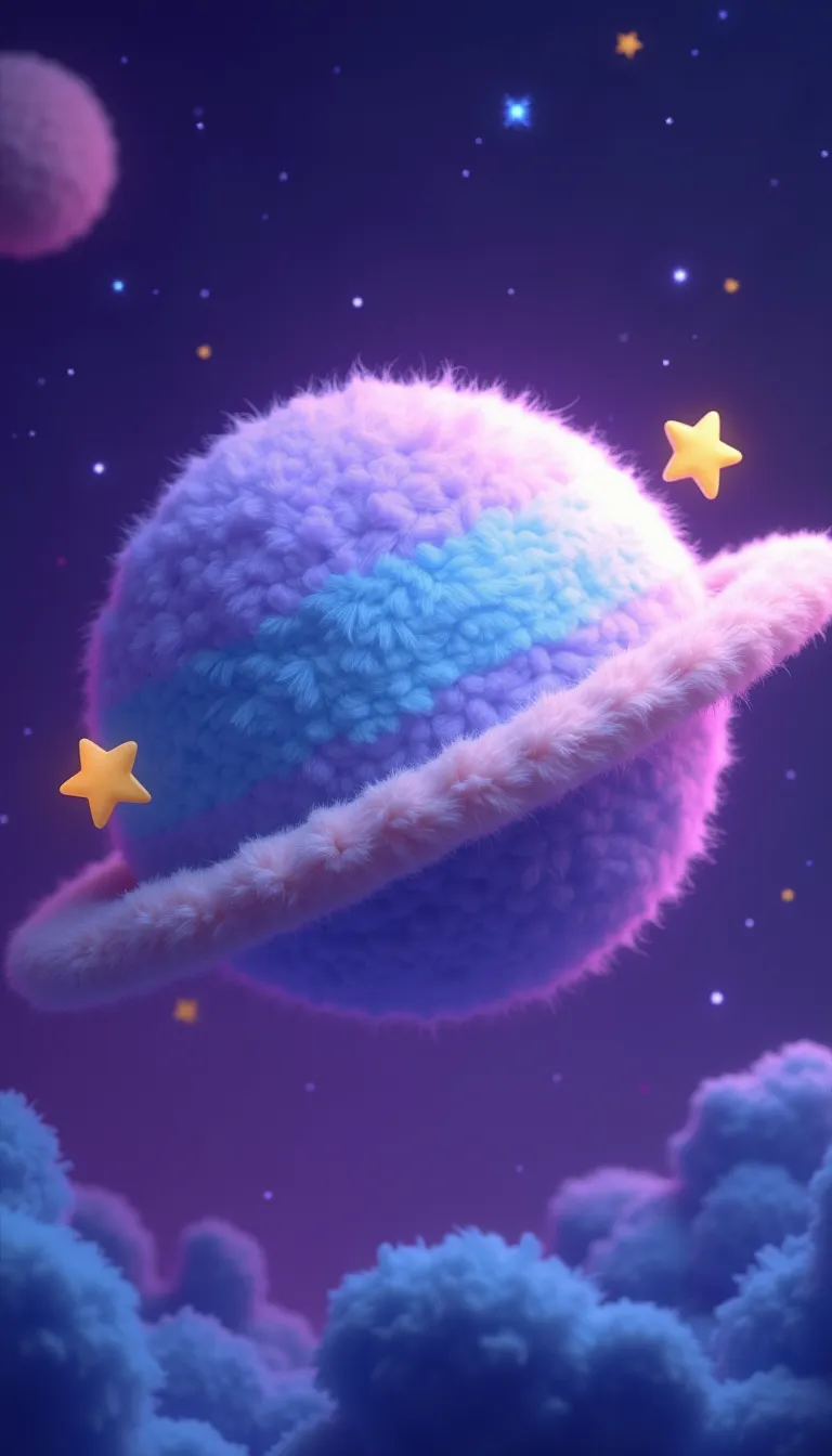 绒毛材质,卡通风格,宇宙中有一个毛绒材质的淡紫色和淡蓝色的卡通星球,有环状带,星球上有一些卡通的黄色的星星,发光的星星,深渊的宇宙银河,