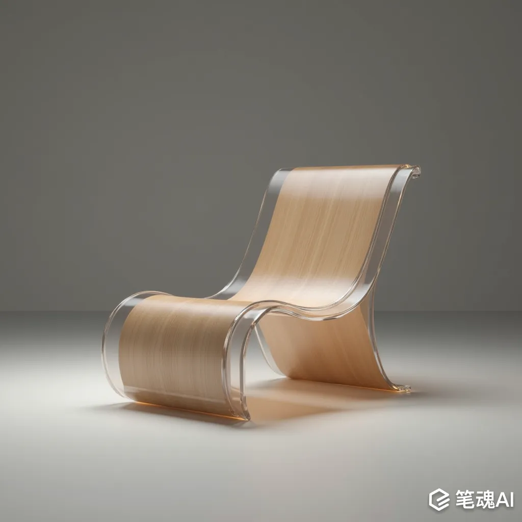 家具设计,一张由半透明材质和木质组合而成的椅子,灰色背景,柔和的光线,C4D OCTANE渲染,电影质感的温暖辉光,高清细节,高分辨率