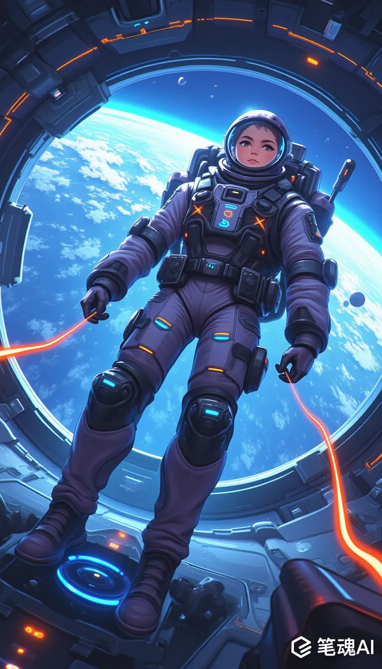 宇航员在未来派宇宙飞船内,在零重力环境下优雅地漂浮。宇航员的服装时尚而高科技,带有发光装饰,强烈的面板线条和富有表现力的运动效果突出了周围漂浮的工具和设备的移动。背景显示了透过大型宇宙飞船窗户看到的令人惊叹的地球景观,构图包括大胆、动态的角度和富有表现力的速度线,营造出英雄和充满活力的氛围。