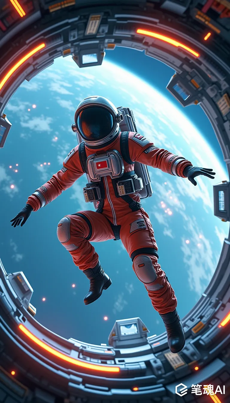 中国宇航员在未来派宇宙飞船内,在零重力环境下优雅地漂浮。宇航员的服装时尚而高科技,带有发光装饰,强烈的面板线条和富有表现力的运动效果突出了周围漂浮的工具和设备的移动。背景显示了透过大型宇宙飞船窗户看到的令人惊叹的地球景观,构图包括大胆、动态的角度和富有表现力的速度线,营造出英雄和充满活力的氛围。