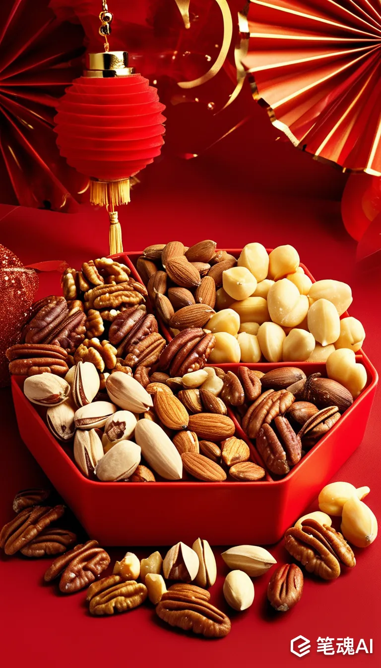 AI绘图作品:红色长方形盒子里的坚果促销是创作者色彩丰富的实现师在2025年01月02日 09:55通过hanvision 4模型生成的智能推荐风格作品,本图片参数如下:长宽比:9:16,尺寸:768x1344,格式:png;您可以通过笔魂Al绘画一键生成同款图片,也可直接免费下载使用。