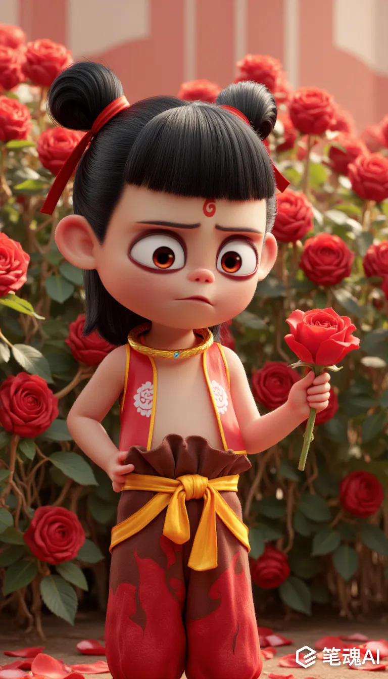 哪吒,哪吒站在盛开的玫瑰丛中,手里拿着一朵鲜艳的玫瑰,表情可爱,周围是玫瑰花瓣。中国神话风格,皮克斯动画风格,辛烷值渲染的 3D 渲染,鲜艳的色彩,错综复杂的细节,电影般的灯光,史诗般的构图