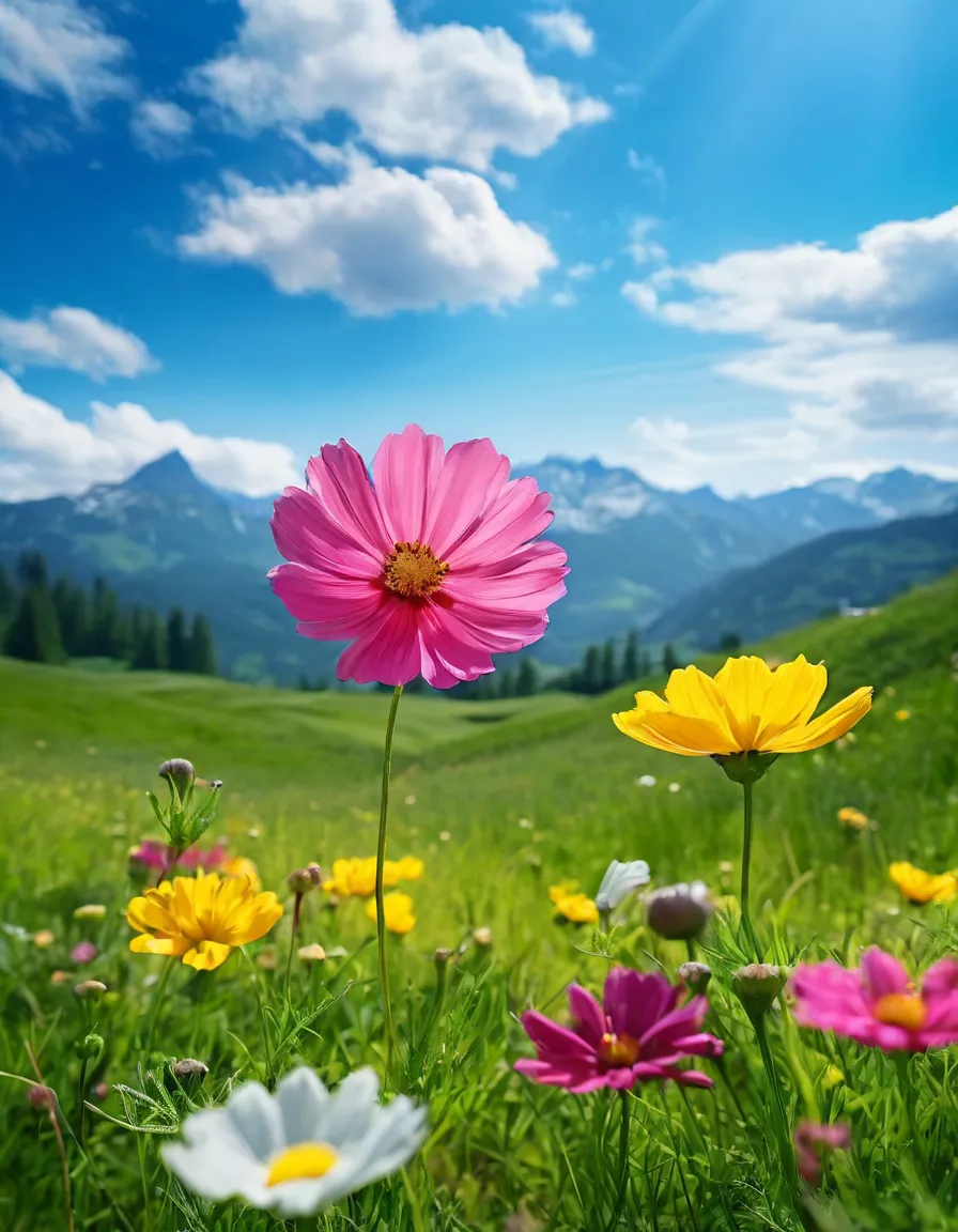 超高清质量,全局光照,景深效果,细节设计,大师杰作,高清画质,颜色高饱和度,高亮度,几朵格桑花,草原,模糊远山