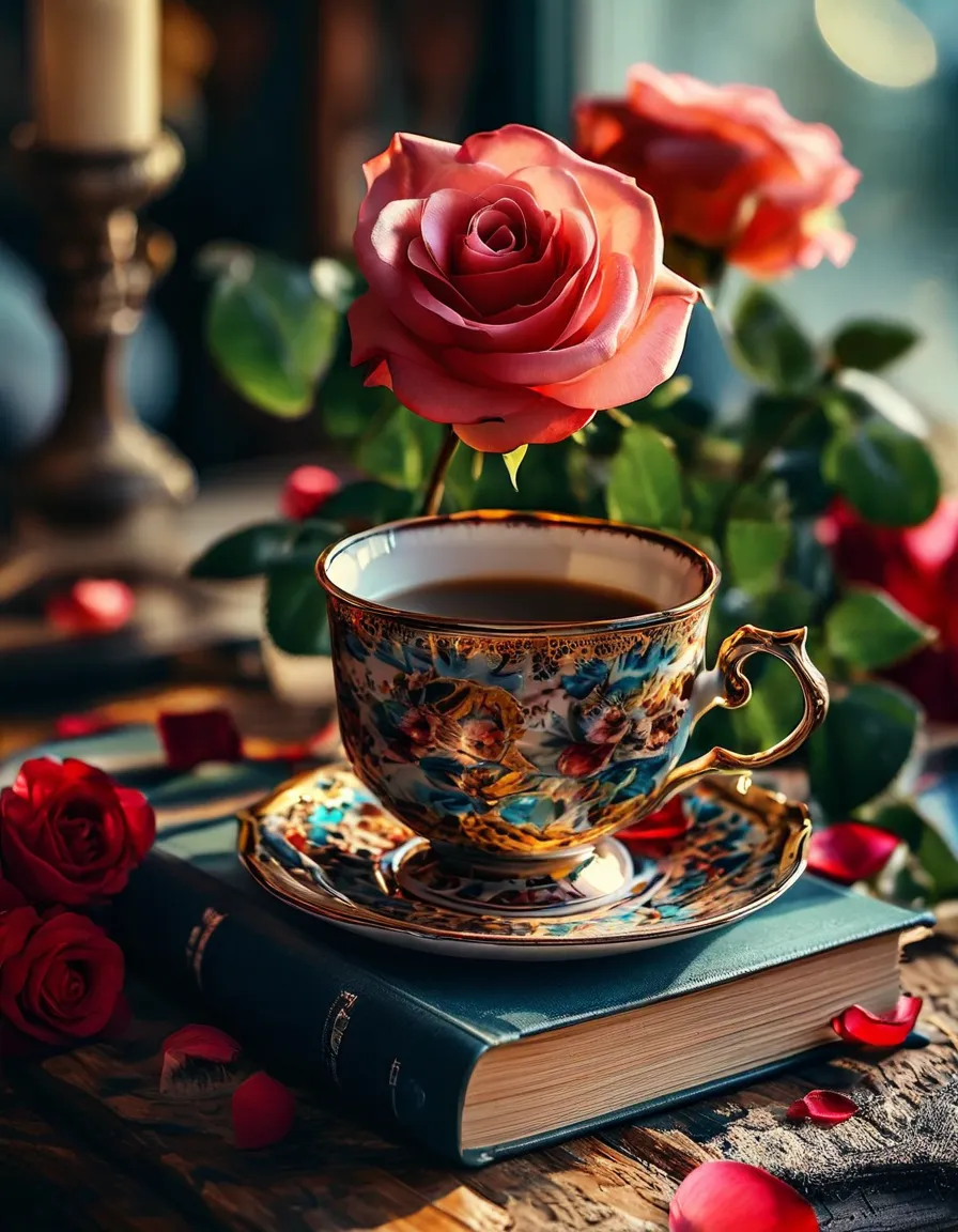 超高清质量,全局光照,景深效果,细节设计,大师杰作,高清画质,颜色高饱和度,高亮度,中景,一杯咖啡,玫瑰花,书