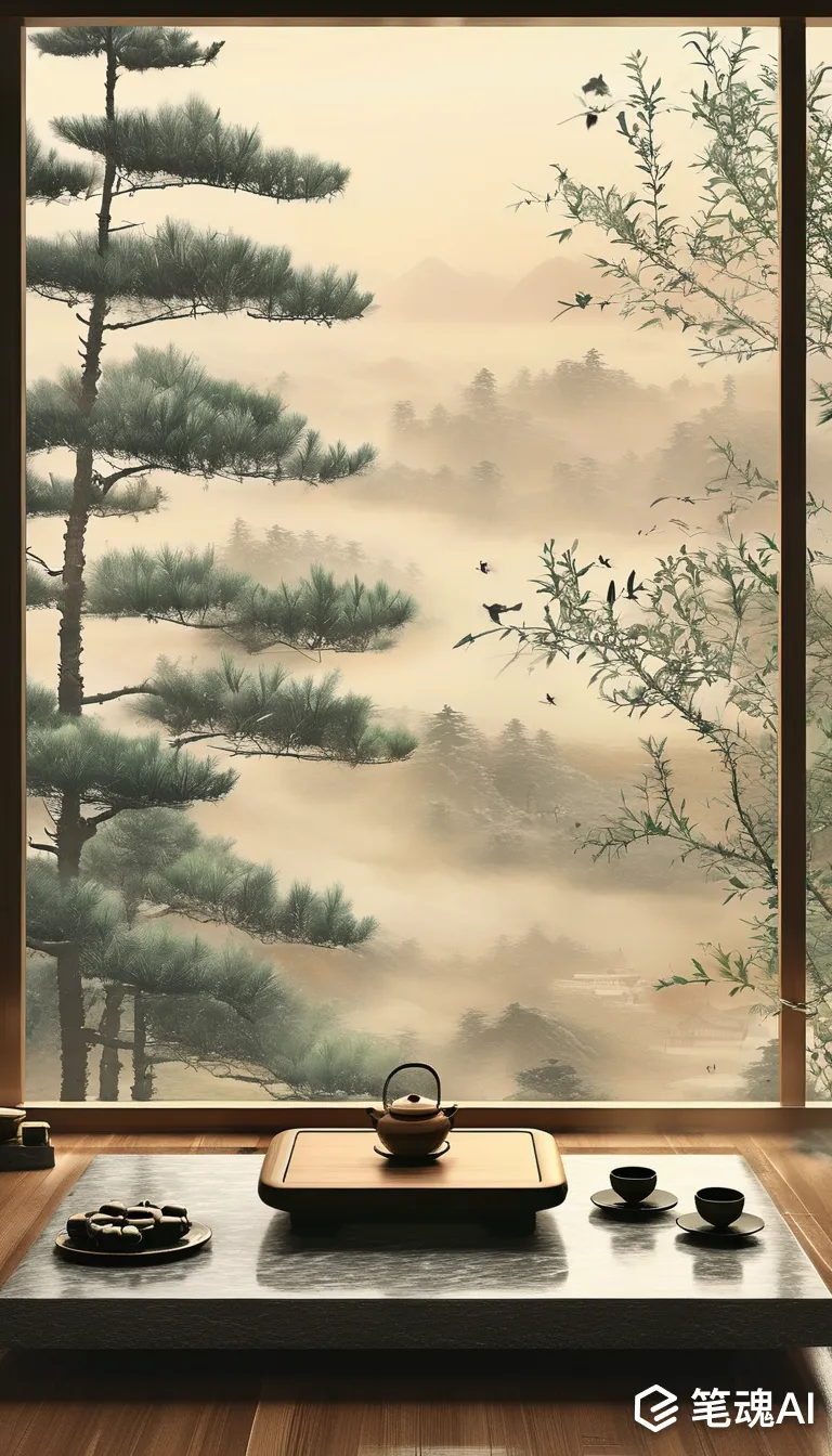 古代中国画风格,清明节主题,古寺庭院场景,石桌上摆放茶具与青团,古松苍劲,远处钟楼隐约可见,俯视构图突出庭院布局,庄重而雅致的氛围,黄昏时分的光线,茶烟袅袅与暮色交融,松针投影在地面,深褐色与墨绿色为主色调,元代文人画风格,8K分辨率,HDR效果,纹理精度400dpi,色彩饱和度+10%,雾气朦胧效果,手绘质感 --ar 3:4 --v 6.0 --style raw