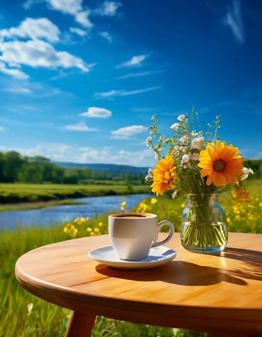 超高清质量,全局光照,景深效果,细节设计,大师杰作,高清画质,颜色高饱和度,高亮度,简单,摄影,一束格桑花,玻璃花瓶,一个白色陶瓷咖啡杯,木桌,毛线衣,背景是草原河流蓝天,阳光,景深。