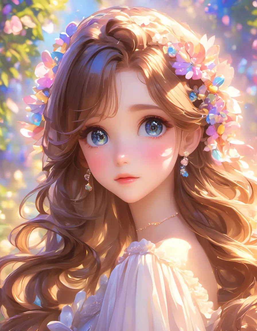 卡通二次元美少女,大眼萌妹,7头身,浅棕色长发,精致的五官,优雅的姿态,可爱,居中构图,炫彩光晕。