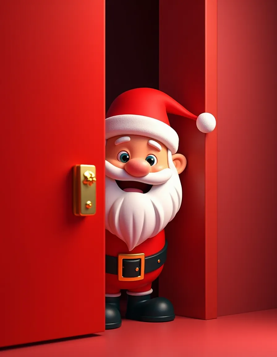 圣诞老人从门后偷看,红色的圣诞背景,卡通感觉,三维