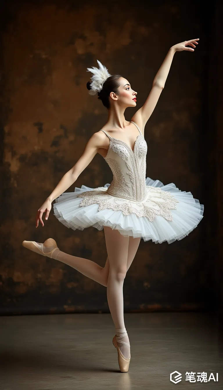 摄影作品,芭蕾舞女演员身着白色带有精致花纹的芭蕾舞裙,头戴白色羽毛装饰,脚穿芭蕾舞鞋,以单脚踮立、另一腿向后高高伸展,一手向上的姿态呈现,背景为复古色调的棕色墙面,展现芭蕾的经典之美