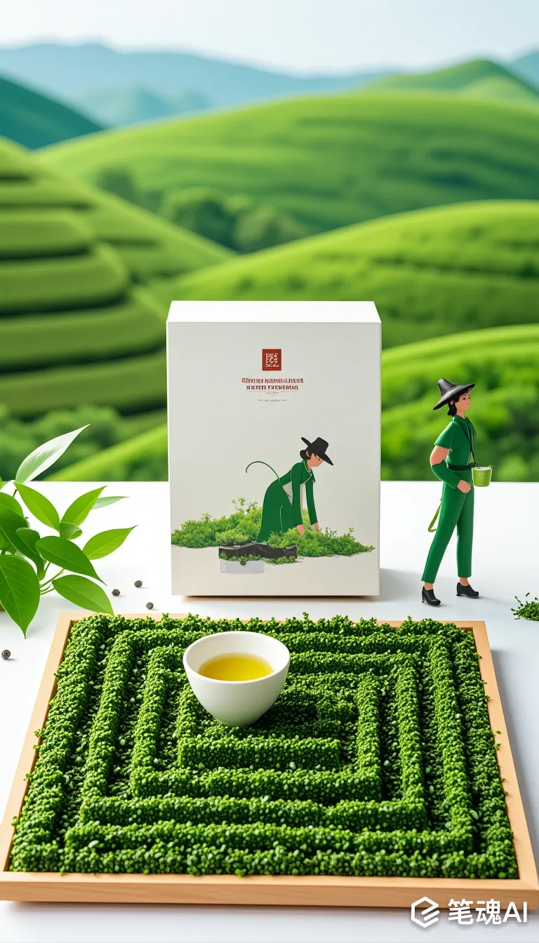 一套茶具置于绿茶叶组成的迷宫前,茶杯里有茶水,后面防着一盒绿茶的包装盒,包装盒上印着一位戴着中国传统帽子的妇女正在采茶,远处是中国茶农在郁郁葱葱的田野里采摘和种植绿叶的插图,扁平,艺术,极简主义,商业,高清。周围的小人正在忙碌地采茶,丰富了画面故事性。背景是宁静的山丘风景,郁郁葱葱的茶园层层叠叠,间或点缀着传统小屋,展现中国茶文化的和谐之美。整个场景采用柔和的自然光线,勾勒出细腻的阴影,传递出一种宁静、优雅与自然融合的氛围。