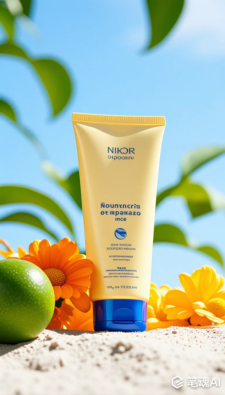 写实商业摄影风格,近景构图,防晒霜置于画面中心偏下位置,放置在白色沙滩上,旁边有一朵橙黄色小花,背景是蓝天与白云。采用明亮自然光线,从左上方照射,形成柔和阴影,营造轻松、愉悦、充满活力的氛围。整体色调明亮清新,以蓝、白、黄、橙黄为主。画面清晰锐利,细节丰富,色彩还原度高,无噪点,超高分辨率 。,摄影感,超高清,最佳质量,极致细节,1080P,32k,广告海报风格,尼康