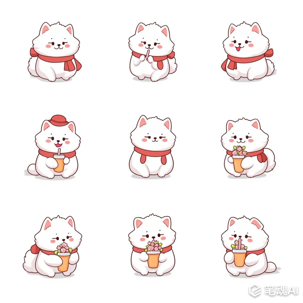 卡通 线条主义 一只白色的萨摩耶,戴着库洛米的围巾和,帽子,萨摩耶有着各种表情 姿势 比如 眨眼睛 害羞 卖萌 比心 喝奶茶。手捧鲜花 特别可爱 身子小小的 胖胖的 插画 九宫格布局。超级可爱