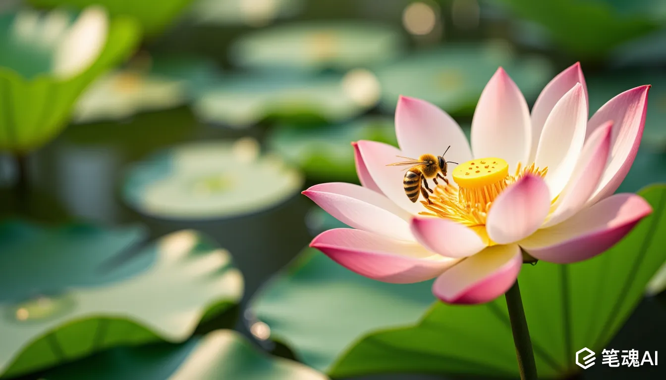 一只蜜蜂在荷花上采蜜,环境背景是宁静的荷塘和睡莲,构图镜头为仰视视角,图像设定为超清晰,高清,8K,真实的细节,最佳质量,富士,光圈F4.0,背景虚化,商业摄影。