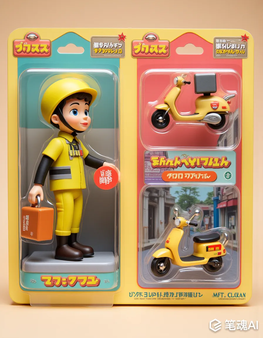 90年代复古泡罩玩具包装,左侧展示粘土风外卖员男孩(戴荧光黄头盔/穿冲锋衣制服/背着保温箱),右侧分格陈列配送装备(迷你电动车模型x1/外卖餐盒x1/电子订单屏x1),塑料包装的底板绘制霓虹城市街道场景,烫金立体字'courier',采用泡泡玛特潮玩风格设计,3D打印质感突出制服反光条与电动车金属部件细节,浅色纯色背景