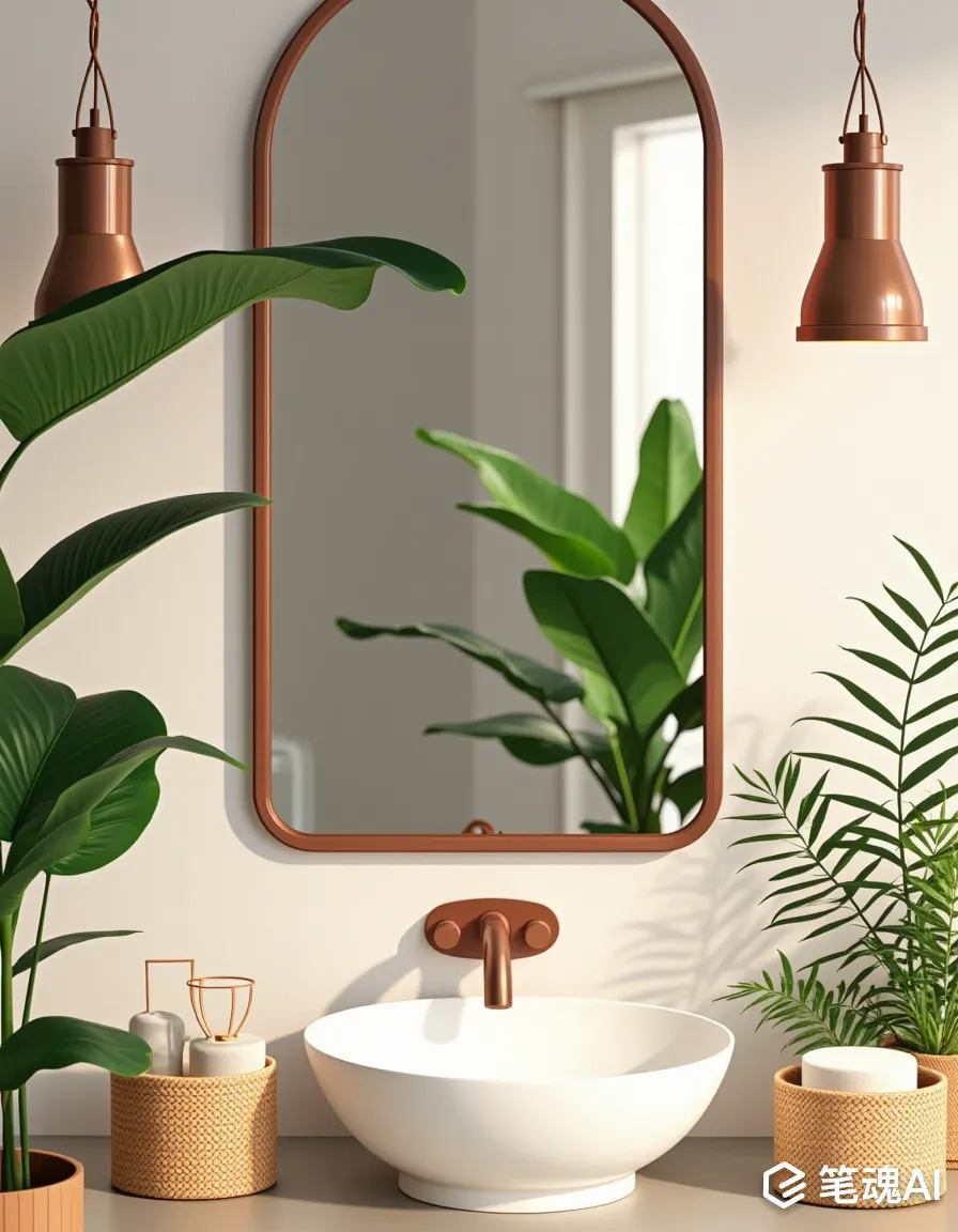 复古铜框浴室镜等距视图,镜面反射绿植与藤编收纳篮,环境背景是波西米亚风格浴室,构图镜头等距视图,图像设定超清晰,高清,8K,真实的细节,最佳质量,哈苏,光圈F4.0,焦距60mm,背景散焦,家居摄影