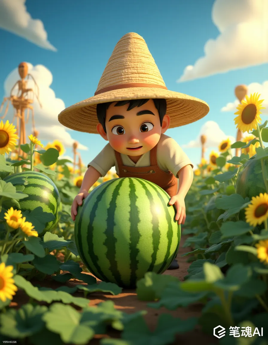 阳光灿烂的西瓜田,戴草帽的中国农民伯伯弯腰捧起巨型西瓜,3D皮克斯卡通造型,圆润五官夸张表情,衣褶质感细腻,背景有稻草人和向日葵,高饱和度色彩与柔光渲染