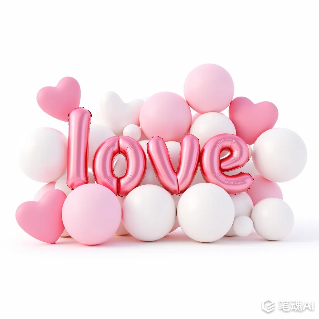 3D 风格的气球组合,白色背景,气球主要为粉色和白色。有一组粉色的字母气球拼成 “love” 字样,周围搭配多个粉色心形气球和白色圆形气球,气球表面有光泽质感,营造出浪漫甜蜜的氛围。