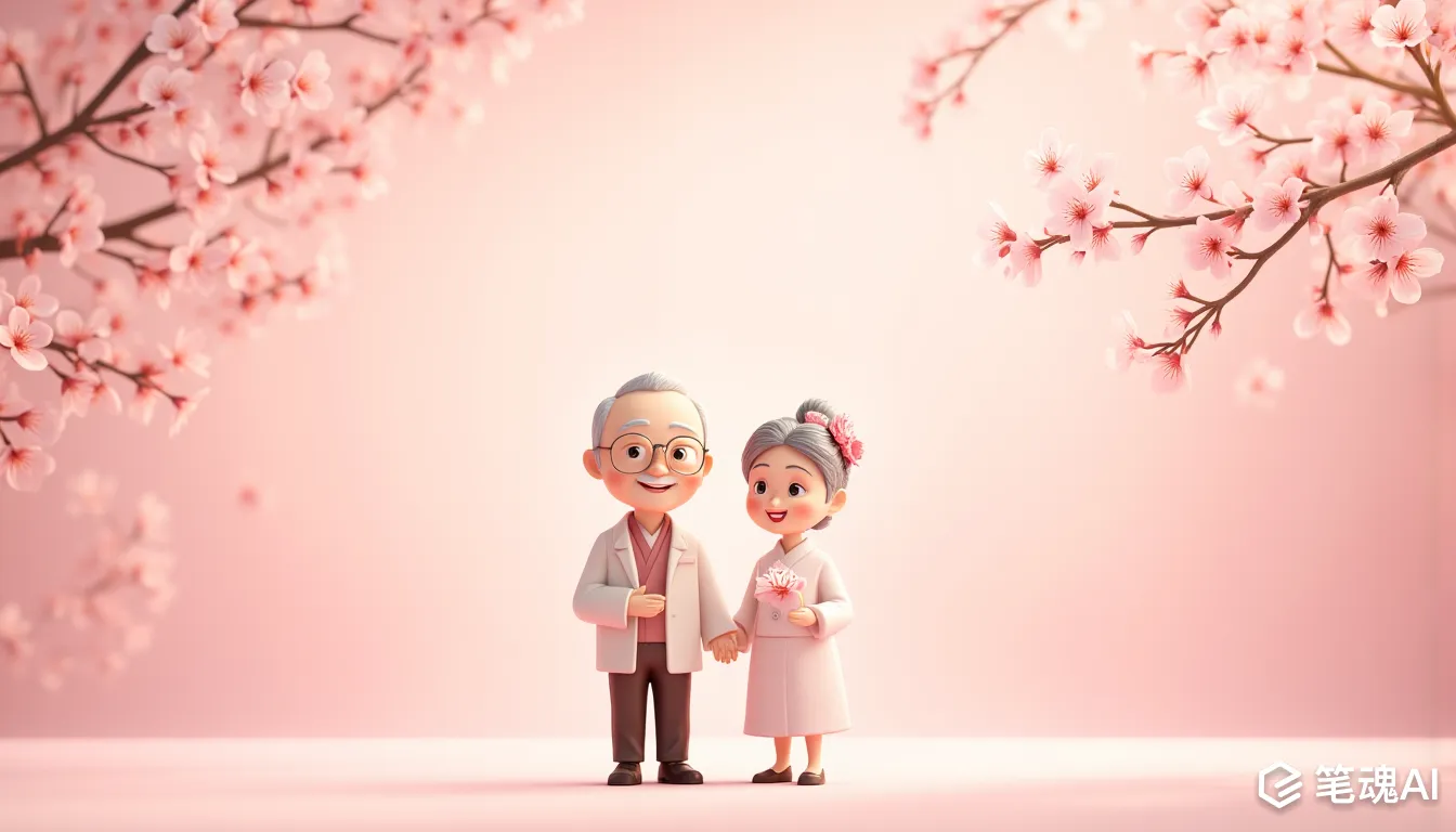 主体元素是一对卡通风格的老年夫妇,主要场景为浅粉色背景,有梅花装饰。风格卡通可爱,色彩以浅粉色背景、白色梅花和人物衣着色彩为主,色调柔和。营造出一种雅致、温馨的氛围,给人宁静、美好的感觉。采用平视角度,构图上夫妇位于画面中心,结构突出人物与梅花装饰的搭配。图片特效添加柔和的光影效果,增强雅致氛围。滤镜为柔和卡通滤镜,强化画面的温馨柔和氛围。生成一张呈现浅粉色背景有梅花装饰中,一对卡通老年夫妇,风格卡通可爱,色彩柔和,色调温暖,氛围雅致温馨,平视构图突出主体搭配,添加光影特效,经柔和卡通滤镜处理的图片。