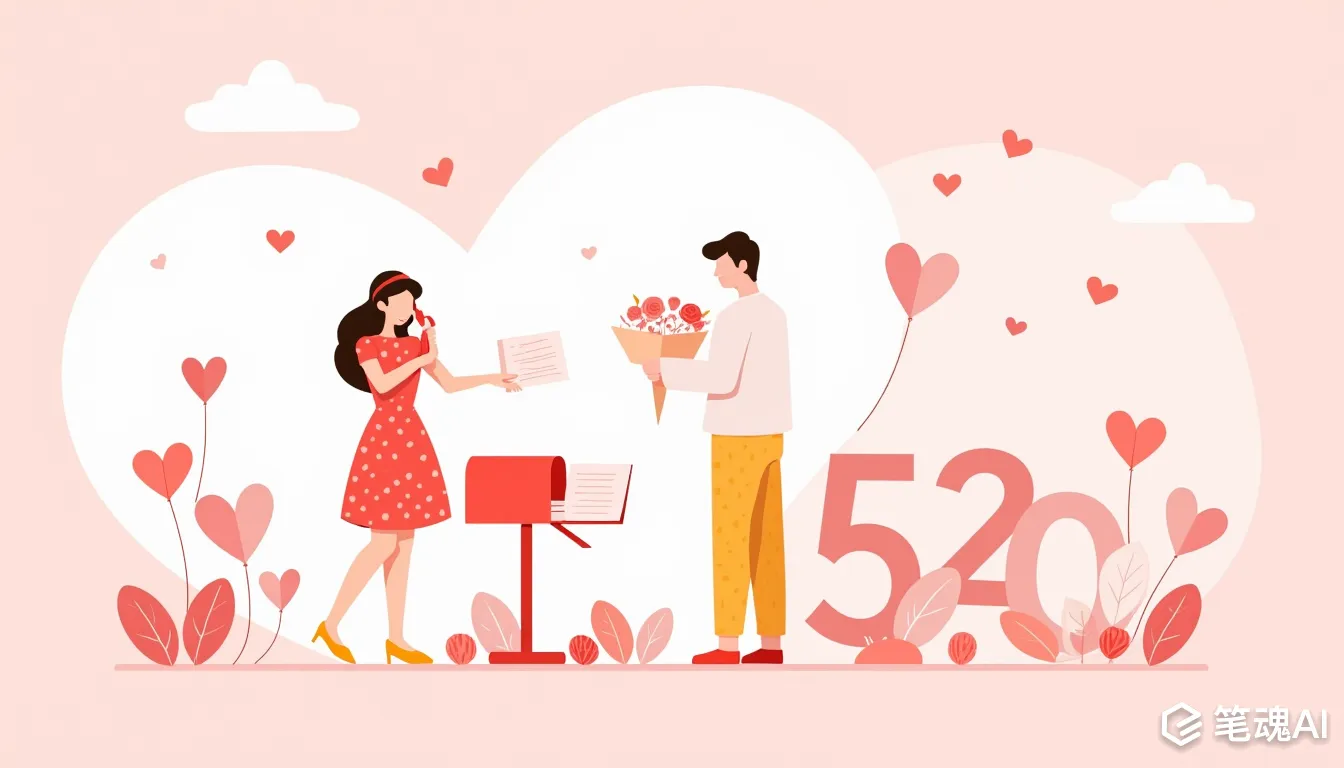 一幅卡通风格插画,背景为浅粉色。画面中心有一大一小两个白色爱心图案重叠。左侧是一位穿红色波点连衣裙、黄鞋,头戴红色发饰的女士,她正拿着纸杯电话倾听,旁边有红色邮筒,里面插着信件,邮筒旁有粉色花朵、草莓和爱心形状装饰。右侧是一位穿白色上衣、黄波点裤、红鞋的男士,手持纸杯电话、信件和玫瑰花束。画面右侧有 “520” 艺术字,周围点缀爱心气球、小爱心和云朵图案,营造出浪漫甜蜜的氛围,极致细节,32k,1080P