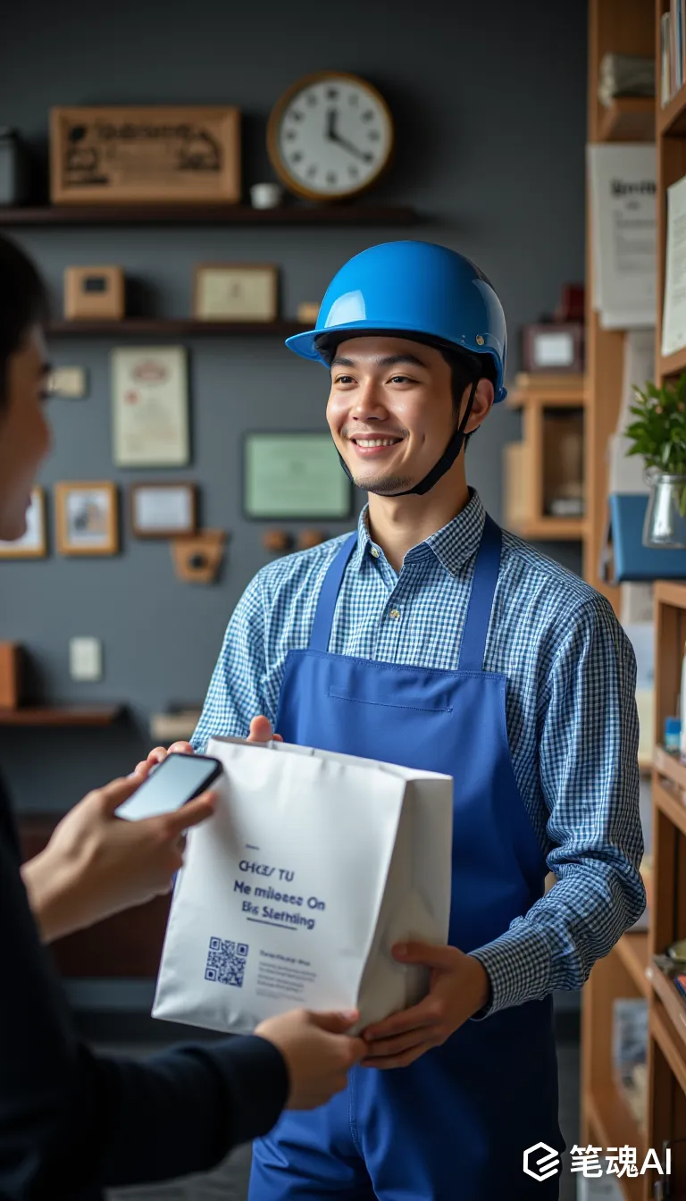 这是一张写实风格的摄影图片。画面中,一位头戴蓝色头盔、身穿蓝白相间外卖服的亚洲外卖员,正站在室内环境中,一只手拿着手机,另一只手接过对方递来的印有文字和二维码的白色外卖袋。背景墙上贴有各种纸张、证书,还有时钟等物品,呈现出一种类似店铺后台的场景。图片真实记录了外卖员取餐的工作环节,展现出其日常工作状态 。高清