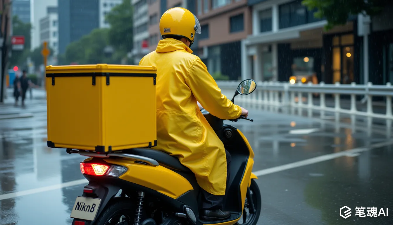 一位头戴黄色头盔、身穿黄色雨衣的外卖骑手驾驶着黄色摩托车,车后座搭载着黄色保温外卖箱子,在雨后潮湿反光的城市道路上行驶,背景可见白色护栏,整体呈现出雨天送餐的场景,摄影感,极致细节,1080P,32k,亚洲男性,尼康