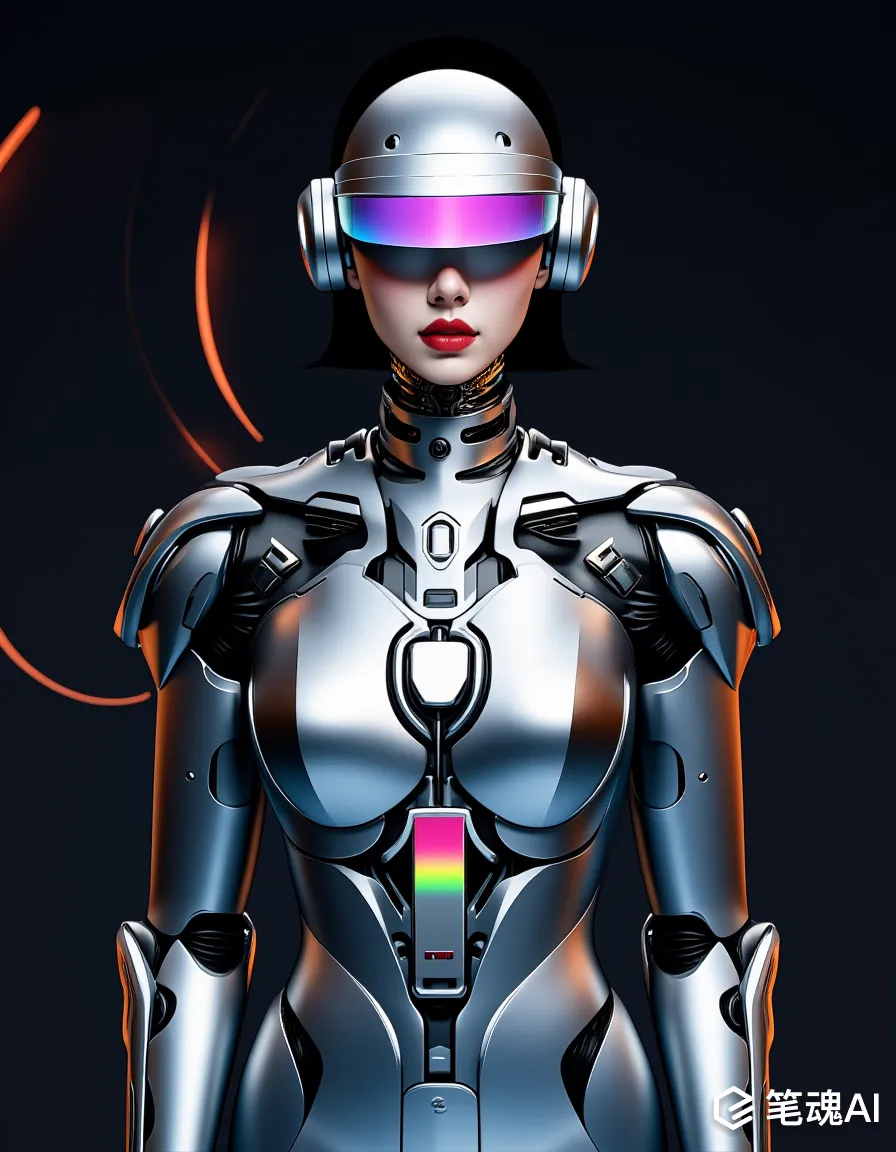 空山基风格,画面张力,冲击力,银色金属女性机器人,复杂的结构,姿势动感,daft punk的头盔,金属质感很强,时尚,彩虹色的光照在脸上,纯黑背景有一些抽象的亮光束,硬光,写实摄影