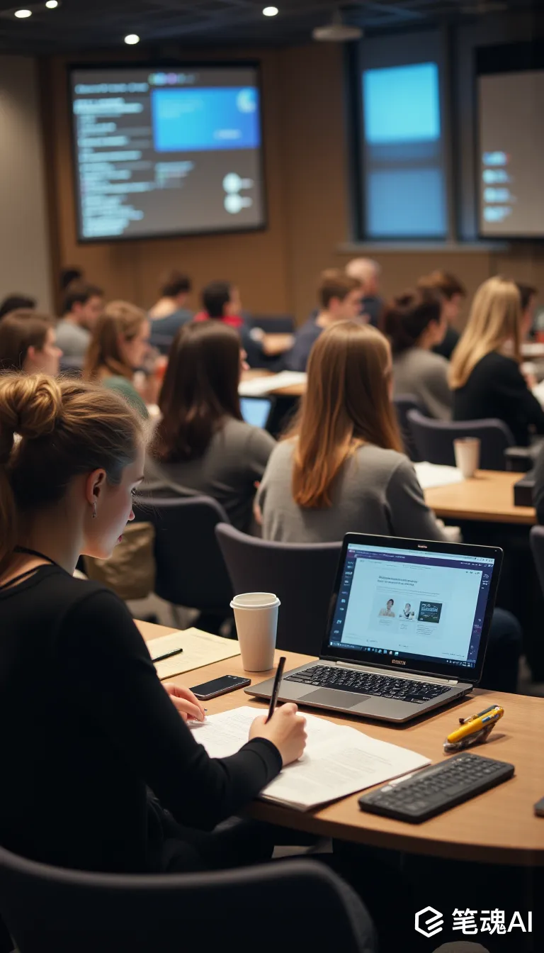 查看人数黑衣学生在教室里专注学习,背景屏幕显示代码,氛围专业严谨