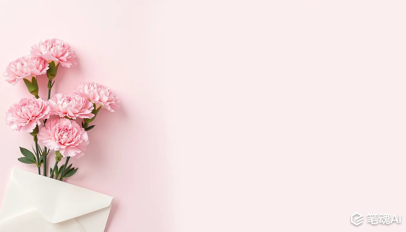 主体为一束粉色康乃馨置于白色信封旁,以文艺清新的插画风格绘制,色彩柔和淡雅,浅粉色系色调,营造出文艺、浪漫的氛围,给人以温婉美好的感觉,采用平视角度构图,结构平衡,添加轻微纸张纹理特效,使用淡雅滤镜。