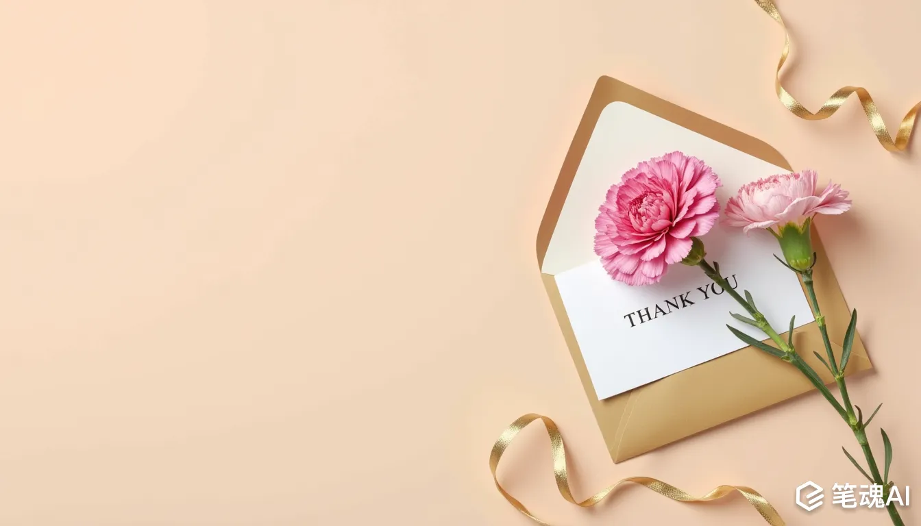 以玫红色康乃馨为主体,放置在印有 “THANK YOU” 字样的白色卡片旁,卡片置于金色信封之上,画面下方有金色丝带装饰,整体场景在米白色背景中呈现。采用写实风格,色彩鲜明对比,金色与白色、玫红色搭配,暖色调为主,营造出感恩、正式且温馨的氛围,给人以诚挚、高雅之感。使用俯视角度构图,结构平衡规整,添加轻微金属质感与花朵光影特效