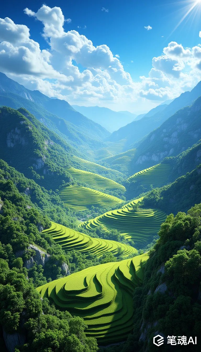 AI绘图作品:蓝天白云下翠绿梯田环绕的山谷风光写意画是创作者设计之力的守护者在2025年05月09日 18:02通过Hanvision 4模型生成的风格作品,本图片参数如下:长宽比:9:16,尺寸:768x1344,格式:png;您可以通过笔魂Al绘画一键生成同款图片,也可直接免费下载使用。