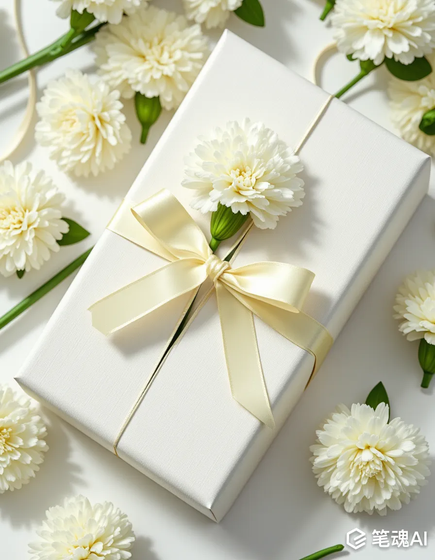 白色康乃馨与礼品盒搭配,丝带缠绕精致包装,采用俯视镜头构图,超清晰,高清,8K,真实的细节,最佳质量,尼康拍摄,光圈F4.0,焦距50mm,广告摄影"