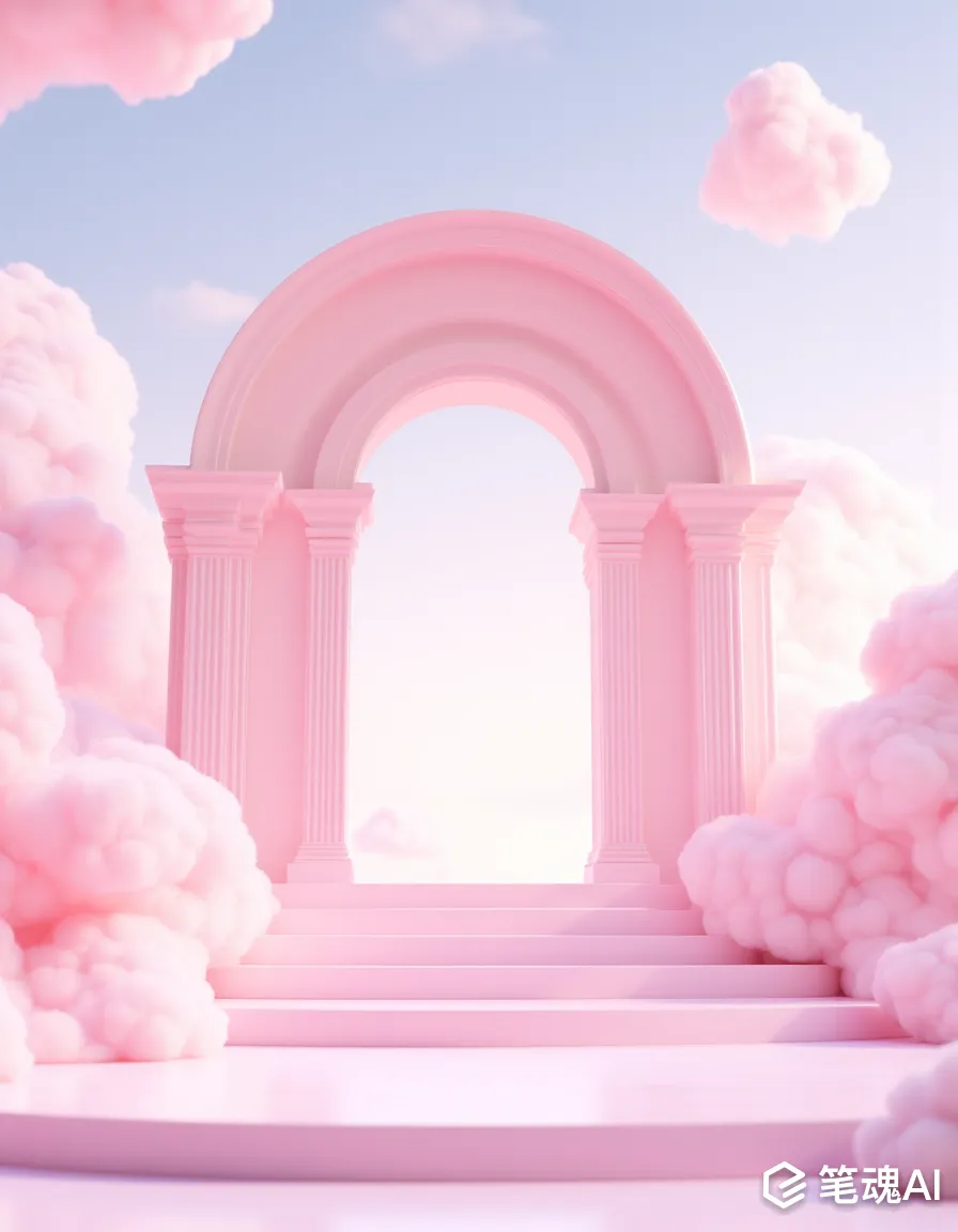 主体元素是粉色的古典拱门,配有白色的柱子和台阶,周围是飘浮的云朵,天空呈现粉蓝渐变。主要场景营造出一种梦幻、童话般的氛围。风格是融合古典与梦幻元素的 3D 渲染风格,色彩以粉色为主,色调柔和浪漫,营造出神秘、美好的氛围,给人一种梦幻、向往的感觉。采用平视角度,构图上拱门位于画面中心,台阶和云朵环绕,结构和谐。添加光影特效突出拱门的立体感和云朵的飘浮感,使用柔和浪漫的滤镜