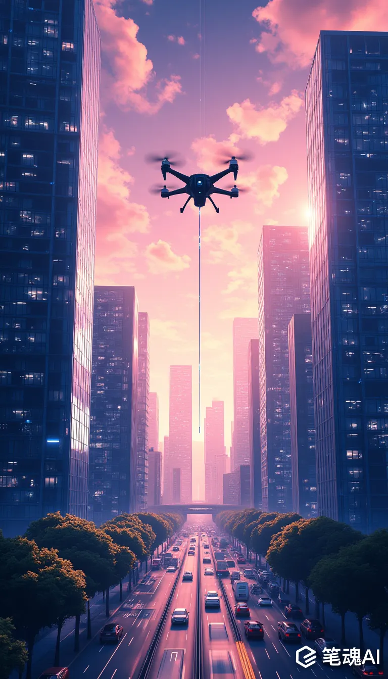 动画卡通,智能无人机在数字城市上空编织着交通网络,环境背景为晨曦中的玻璃幕墙摩天大楼。